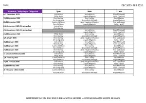 Parish Rotas Readers March – May 2025 Eucharistic Ministers December 2025- February 2026Eucharistic Ministers Rotas Eucharistic Ministers May- August 2025 Eucharistic Ministers Sept – Nov 2025 Readers Rotas Readers March – May 2025 Readers May – August 2025 Readers September – Nov 2025